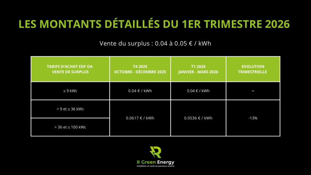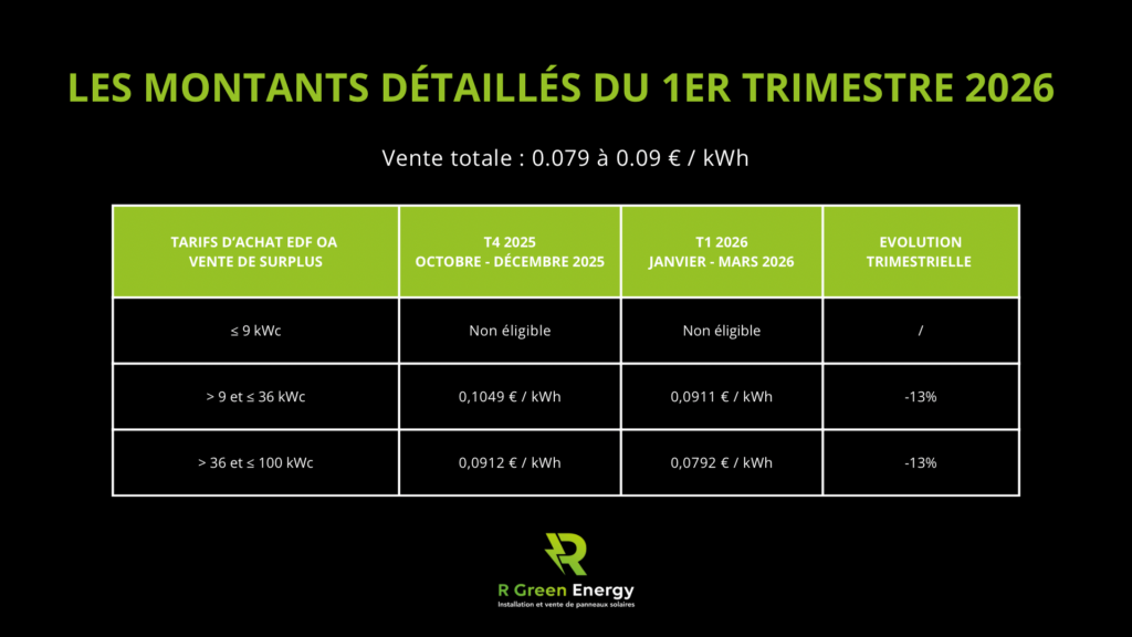 Les tarifs de vente totale applicables au premier trimestre 2026 sont également revus à la baisse pour les puissances supérieures à 9 kWc, tout en restant garantis sur une durée de 20 ans dans le cadre du contrat EDF OA.